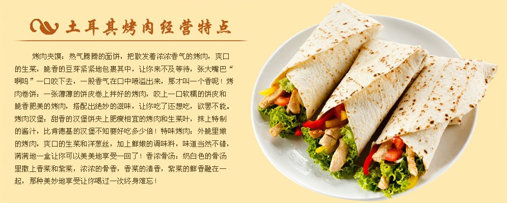 土耳其烤肉品种:土耳其烤肉夹馍 ★土耳其烤肉卷饼 ★土耳其烤肉拌饭 ★土耳其烤肉汉堡 ★土耳其烤肉夹馍 ★香浓骨汤等